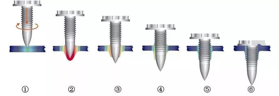 在拧紧过程开始时,热融螺钉置于无预先钻孔的铝板或薄钢板的表面,高速旋转的螺钉向工件表面施加高下压力,同时产生极高的摩擦热,融化金属。随后,螺钉顶端穿透材料,形成穿孔,并逐渐开始攻螺纹,一旦螺纹形成,螺钉按照预设的扭矩进行拧紧。热融紧固连接工艺步骤与过程说明,包括六个阶段:旋转(加热)→穿透→通孔→攻螺纹→拧螺纹→紧固。